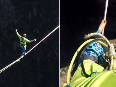 آنکھوں پر پٹی باندھ کر سیکڑوں میٹر بلندی پر رسی پر چلنے کا مظاہرہ