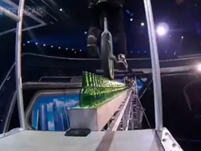 شیشے کی بوتلوں پر ایک پہیے والی سائیکل چلانے کا شاندار مظاہرہ